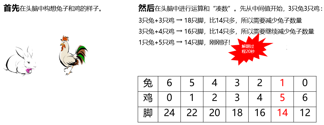 笼子里有若干只鸡和兔,从上面数有 6个头,从下面数有14只脚,鸡和兔各有多少只?