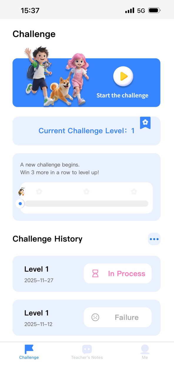 FuturKids is a student-oriented app. Students are granted access to the app once their institution offers the corresponding course. It is a challenge-based game consisting of 10 difficulty levels, which align with the courses from Bronze 1 to Silver 14. By tackling challenging problems, students can enhance their logical thinking skills. Additionally, the app allows students to receive messages and guidance from teachers sent via the Children Personalized Management System.